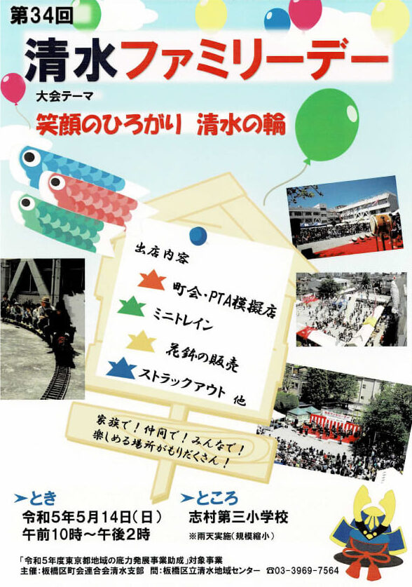 コロナ禍で3年ぶりの開催となった、清水地区11町会の合同イベント「第34回清水ファミリーデー」が、5月14日(日)午前10時から午後2時まで、志村第三小学校で開催されました。