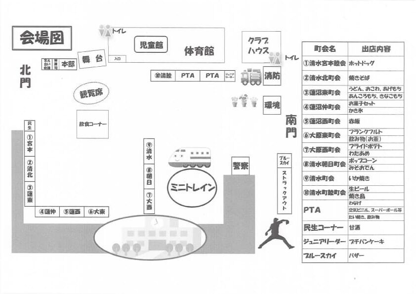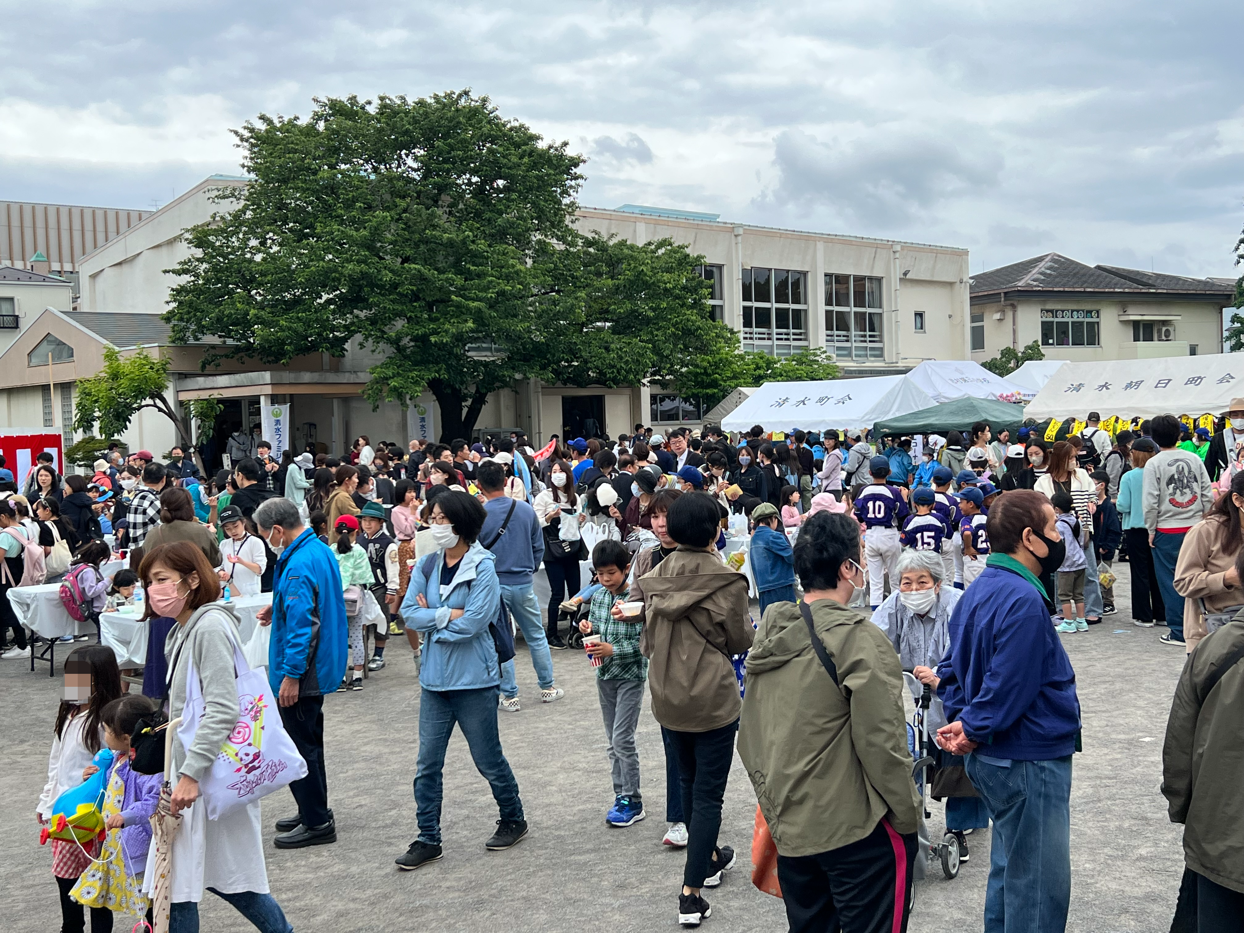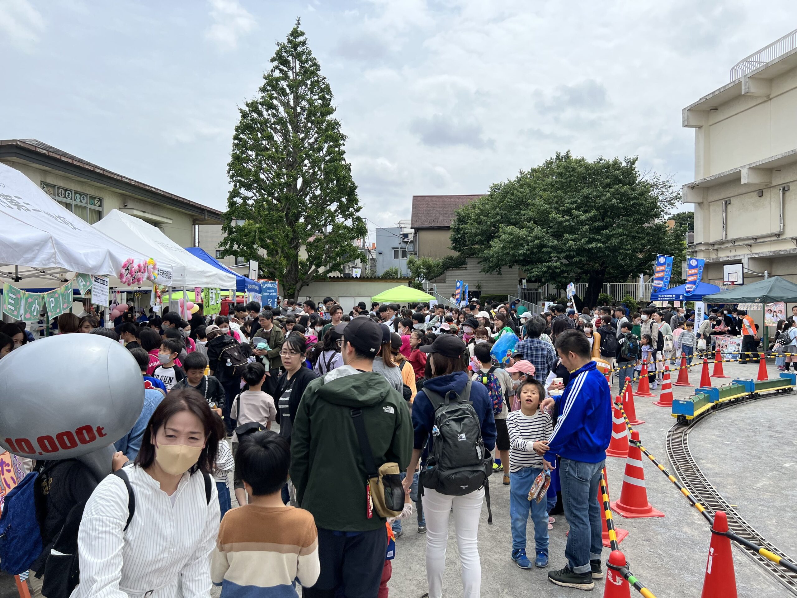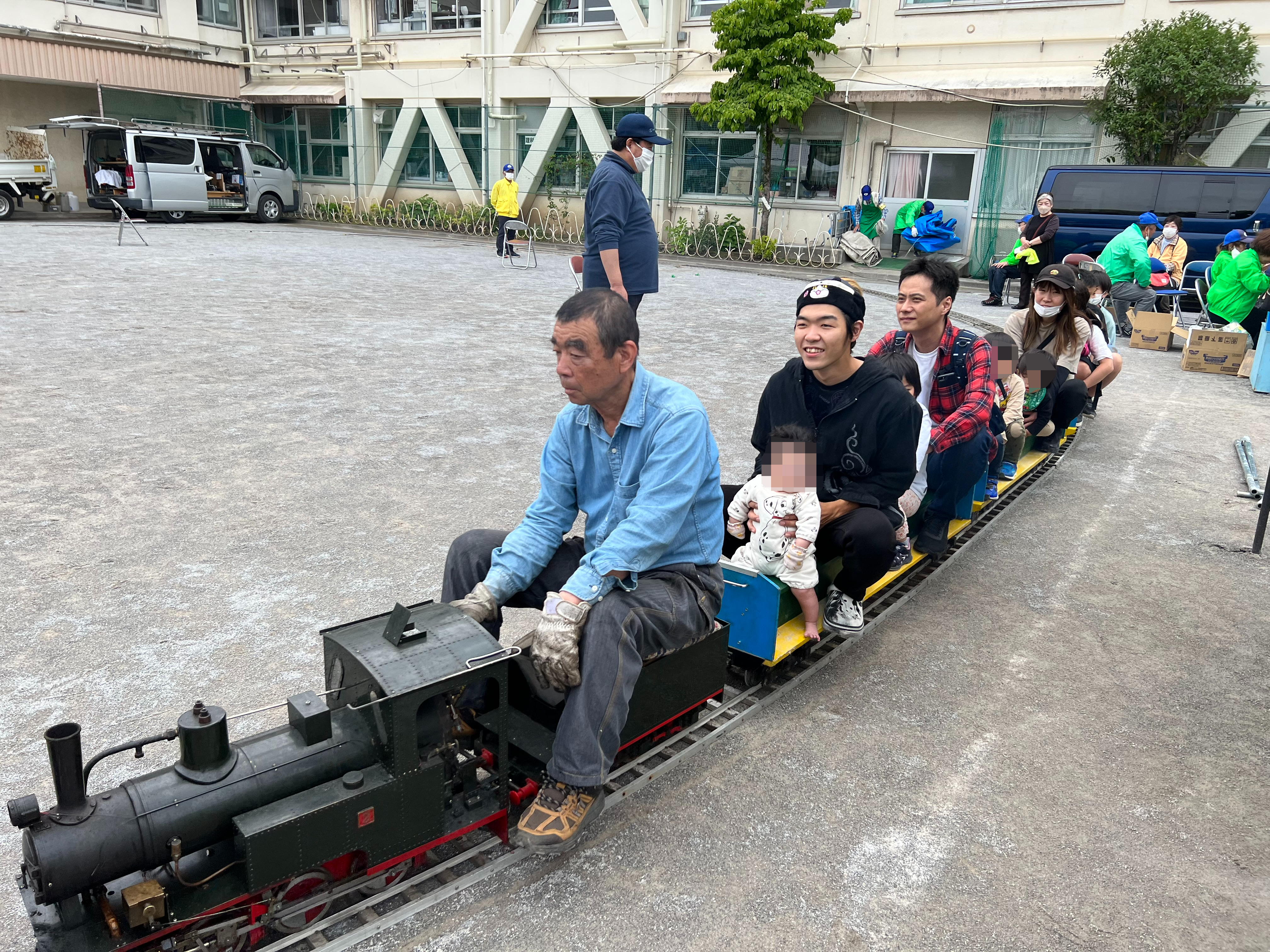 各町会や学校PTAのゲームや飲食などの模擬店と、代表グループによるパフォーマンスステージ。前日からの悪天候で雨が予想されていたため、野外ステージは体育館へと移動。午前10時からの式典を合図に、地元ファミリーの皆さんが続々と来場し、お目当ての模擬店やゲーム、ステージに長蛇の列ができました。ミニトレインでは、順番を待つちびっ子たちのうれしそうな表情が印象的でした。