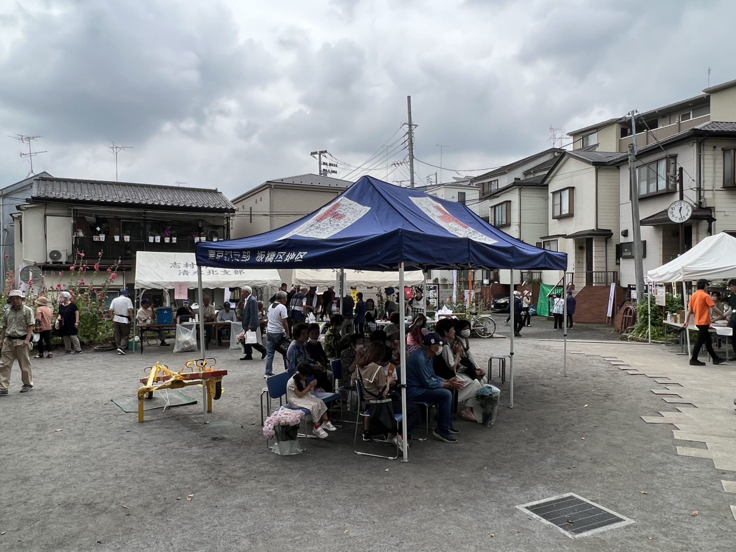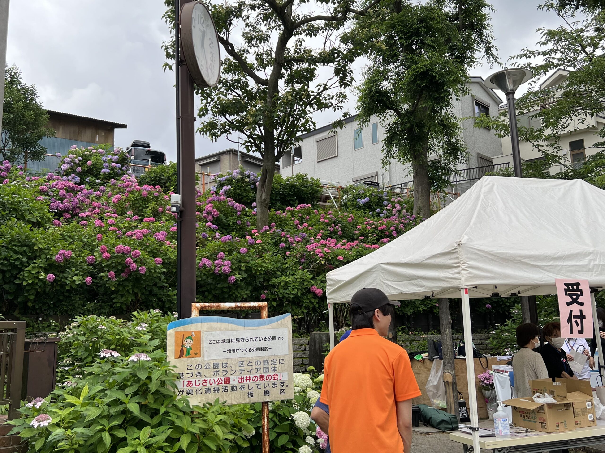 今回は、西町会は模擬店を出しませんでしたが、いくつかの町会が出店し、やきそばやビールを片手にあじさいを楽しむ方々が多くいました。そして、開会式のあとは、あじさいに囲まれてのカラオケ大会。