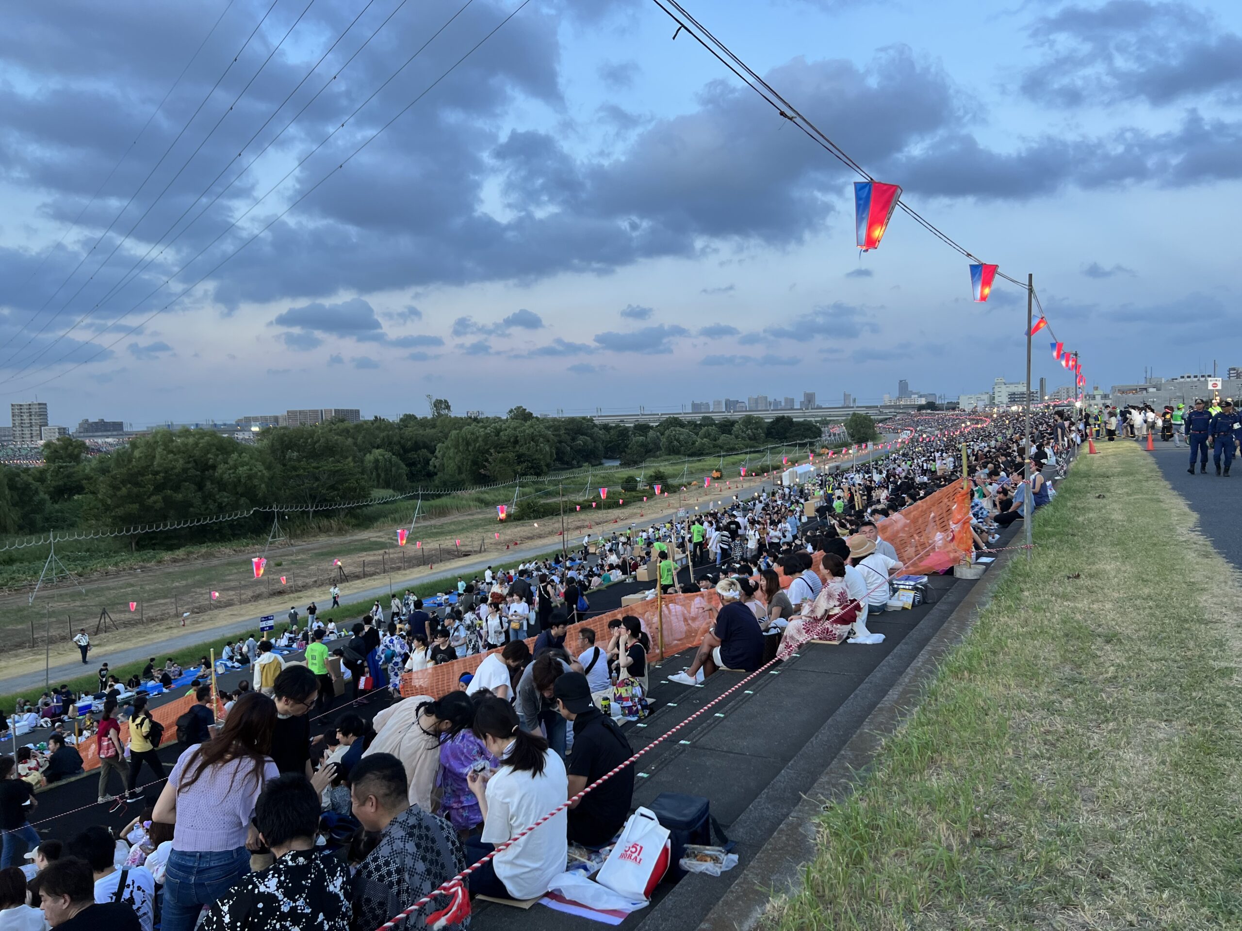 コロナ禍ですべてが中止になった4年間、板橋区民にとっては待ちに待った開催ではなかったでしょうか。両岸で打ちあがる13,000発の花火を楽しみに、例年50万人が訪れます。今年も、ファミリー、グループ、カップルと花火を楽しみに多くの方々が来場しました。区内の各町会からは100名を超えるスタッフが防犯警戒要員として参加し、当町会からも7名が出動しました。