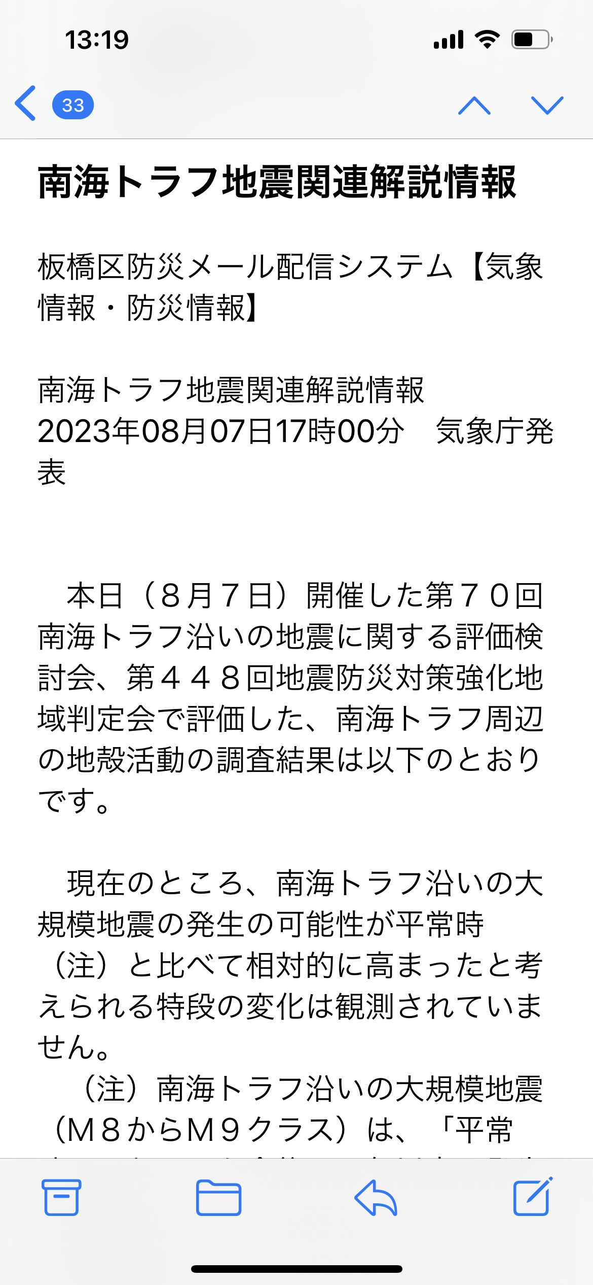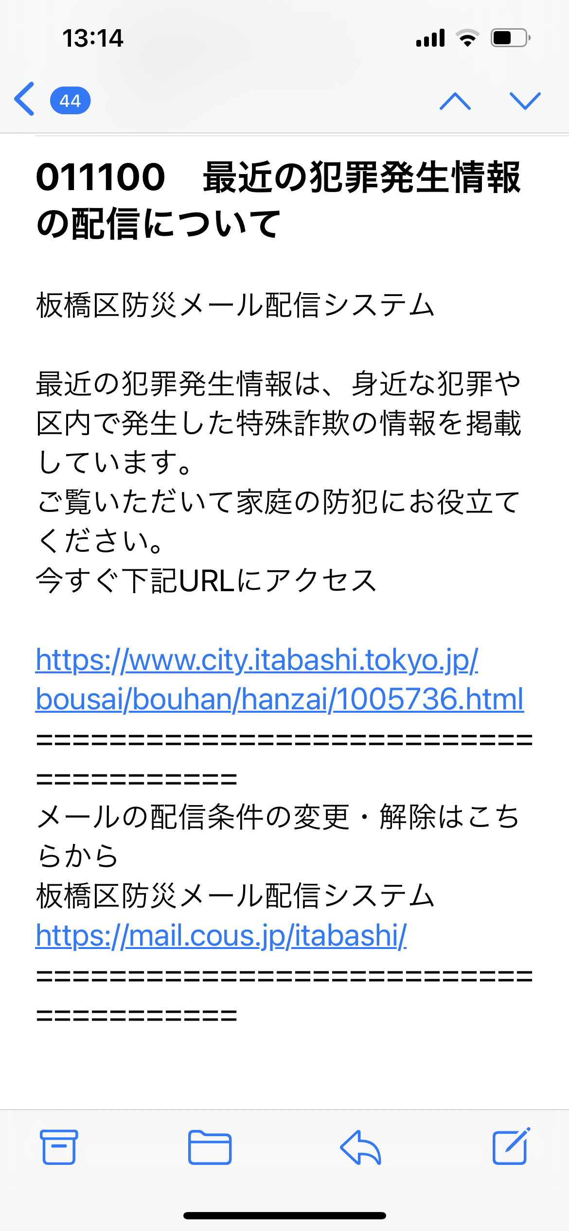 気象庁が発表する各種気象情報、区で観測する雨量・河川水位情報、南海トラフ地震情報、避難情報、緊急情報、犯罪発生情報、板橋区からの緊急なお知らせなどを携帯電話やスマートフォン・パソコンに電子メールで配信するサービスです。